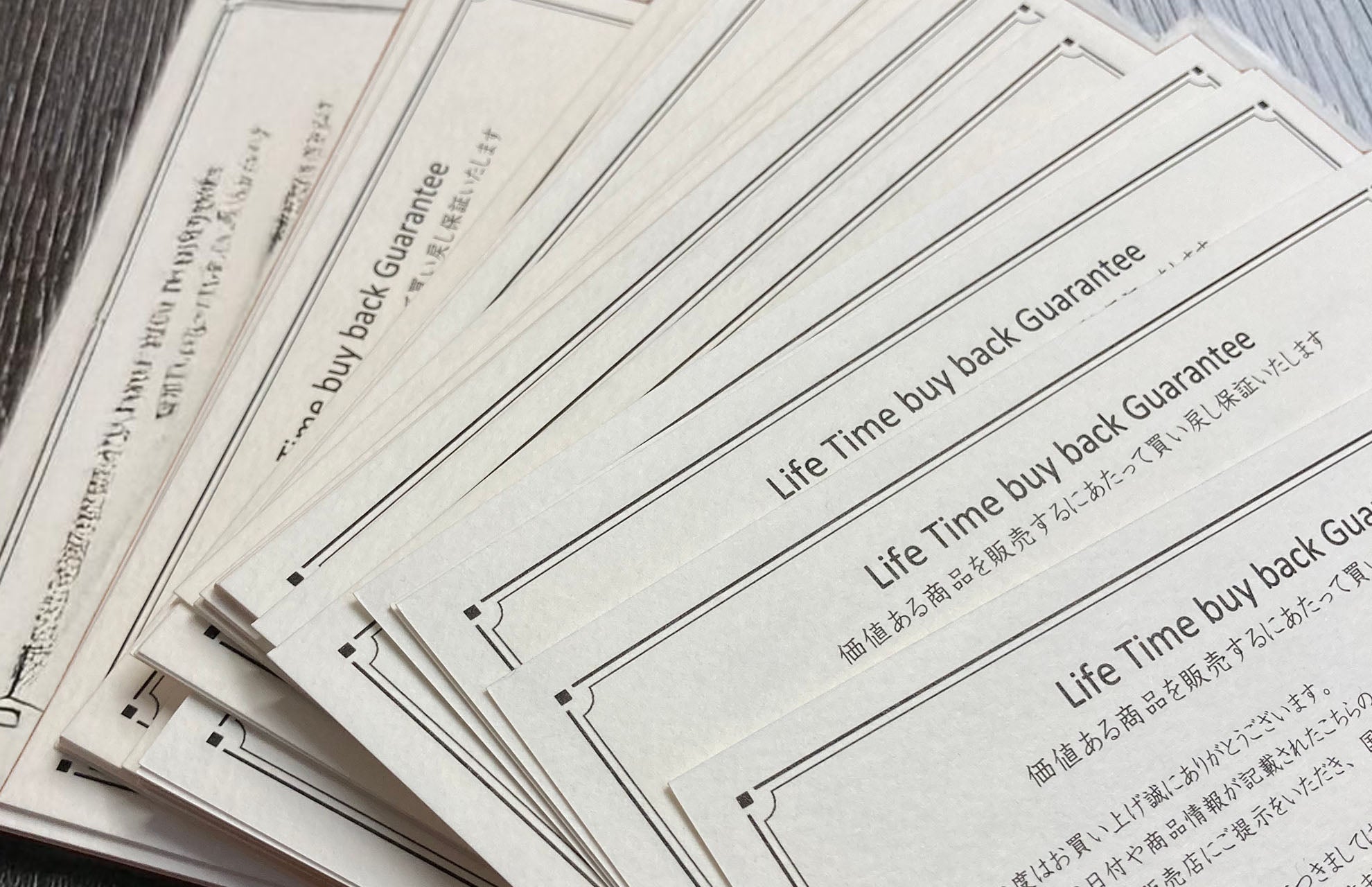 ご購入頂きました商品につきましては一生涯の買い取り保証をいたします。